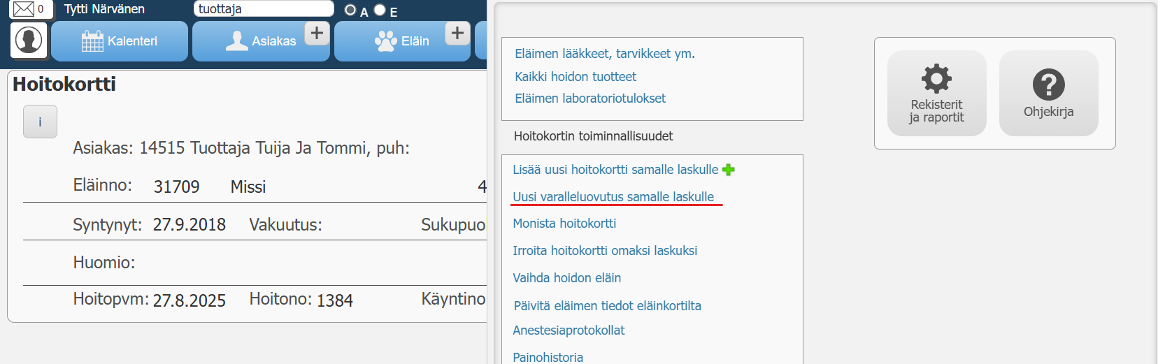 Tuotantoeläimille varalleluovutus on tehtävä ”Varalleluovutus”-toiminnolla. Varalleluovutus-toiminto löytyy Asiakaskortilta ja Hoitokortin Idealamppu-painikkeen alta. Tällöin mikrobilääketiedot siirtyvät oikein Ruokavirastoon.